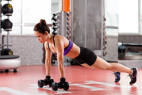 | Chống đẩy với tạ: Bài tập này tác động lớn tới cơ lưng và làm săn chắc vùng cơ thể này. Cách thực hiện: Đặt hai quả tạ trên sàn và thực hiện tư thế chống đẩy, hai tay đặt tạ cách nhau rộng bằng vai. Lúc này, cơ thể phải cứng và phẳng như một tấm ván, tạo thành đường thẳng từ đầu đến chân. Giữ nguyên tư thế trong 30 giây. Sau khi tập bài này một thời gian, bạn nên tăng cường độ khó bằng cách chống đẩy với tạ thay vì chỉ giữ. Đồng thời, chúng ta có thể kết hợp giữ thăng bằng với một tay, tay còn lại nâng tạ lên sát ngực tương tự động tác ở trên. Ảnh: Eatthis. |