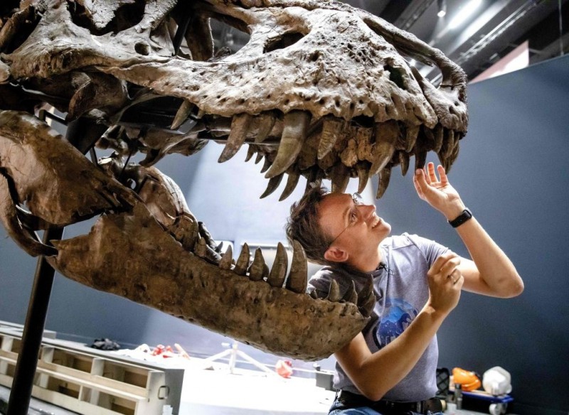 | T-Rex (khủng long bạo chúa) sống vào cuối kỷ Phấn Trắng. Đây là loài vật ăn thịt, đi bằng 2 chân. Nó ăn thịt nhiều loại khủng long khác và cả xác thối. Theo giới nghiên cứu, lực cắn của T-Rex mạnh hơn hầu hết loài động vật sống trên cạn. Trong ảnh, Naturalis Anne Schulp, nhà cổ sinh vật học, đang dựng lại bộ xương của con T-Rex tên Trix. Ảnh: Bart Maat. |