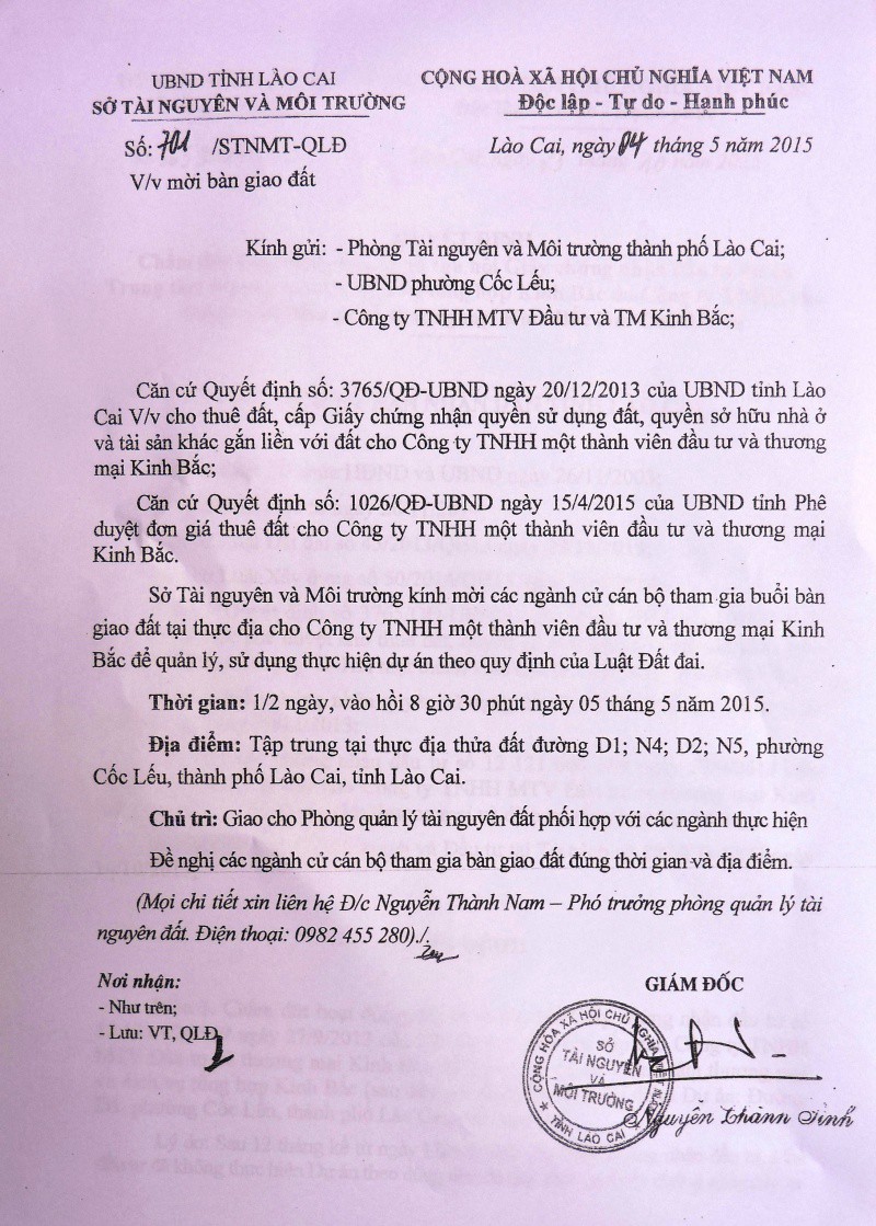 Nhưng phải đến hai năm sau, ngày 5/05/2015, Sở Tài Nguyên và Môi Trường tỉnh Lào Cai mới chính thức bàn giao đất trên thực địa cho Công ty. Theo Lãnh đạo Công ty cho biết: Sau khi được giao đất, Công ty đã làm đầy đủ thủ tục xin điều chỉnh tổng mặt bằng và phương án kiến trúc. Dự án gửi UBND Tỉnh Lào Cai và các sở, ban, ngành liên quan. Chỉ sau khi có kết quả trả lời chính thức của các cơ quan có thẩm quyền của tỉnh, thì Công ty mới tiếp tục đầu tư. Tuy nhiên, sau một thời gian chờ đợi, Công ty vẫn không nhận được bất cứ ý kiến hồi âm nào của tỉnh Lào Cai.