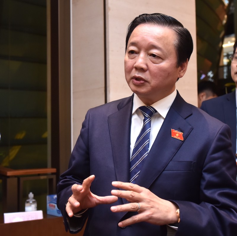 | Bộ trưởng Trần Hồng Hà báo cáo trao đổi bên với đại biểu bên hành lang. Ảnh: VGP/ Lê Sơn |